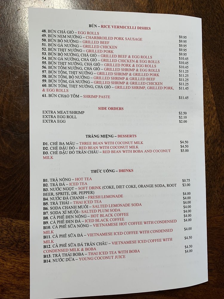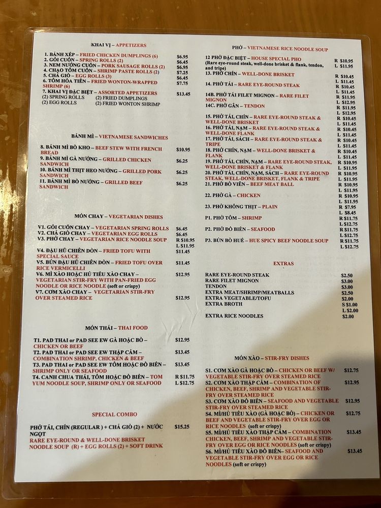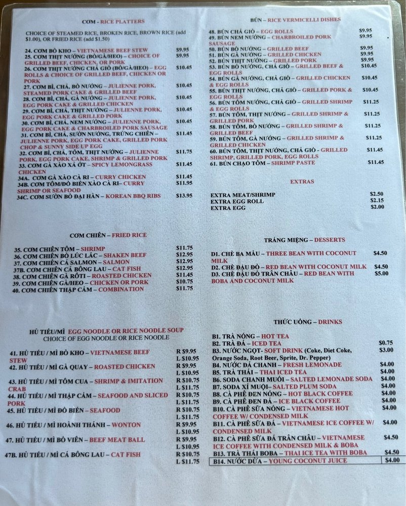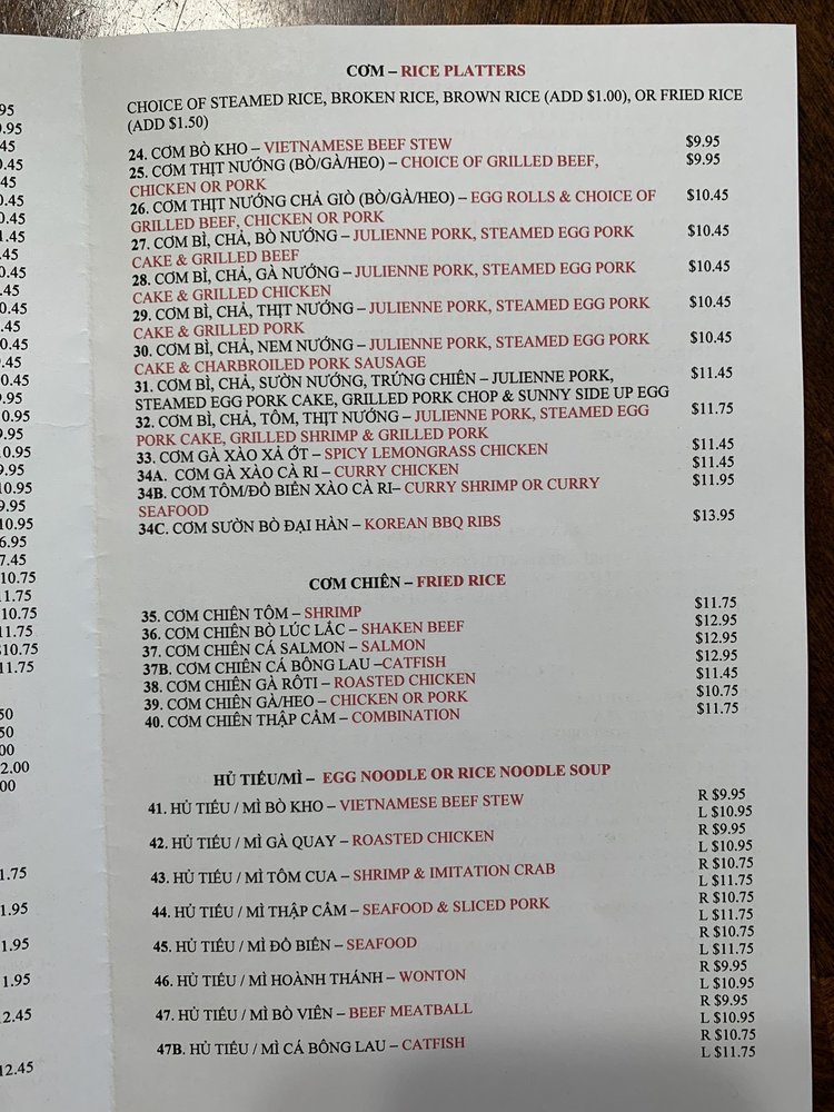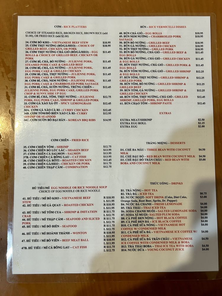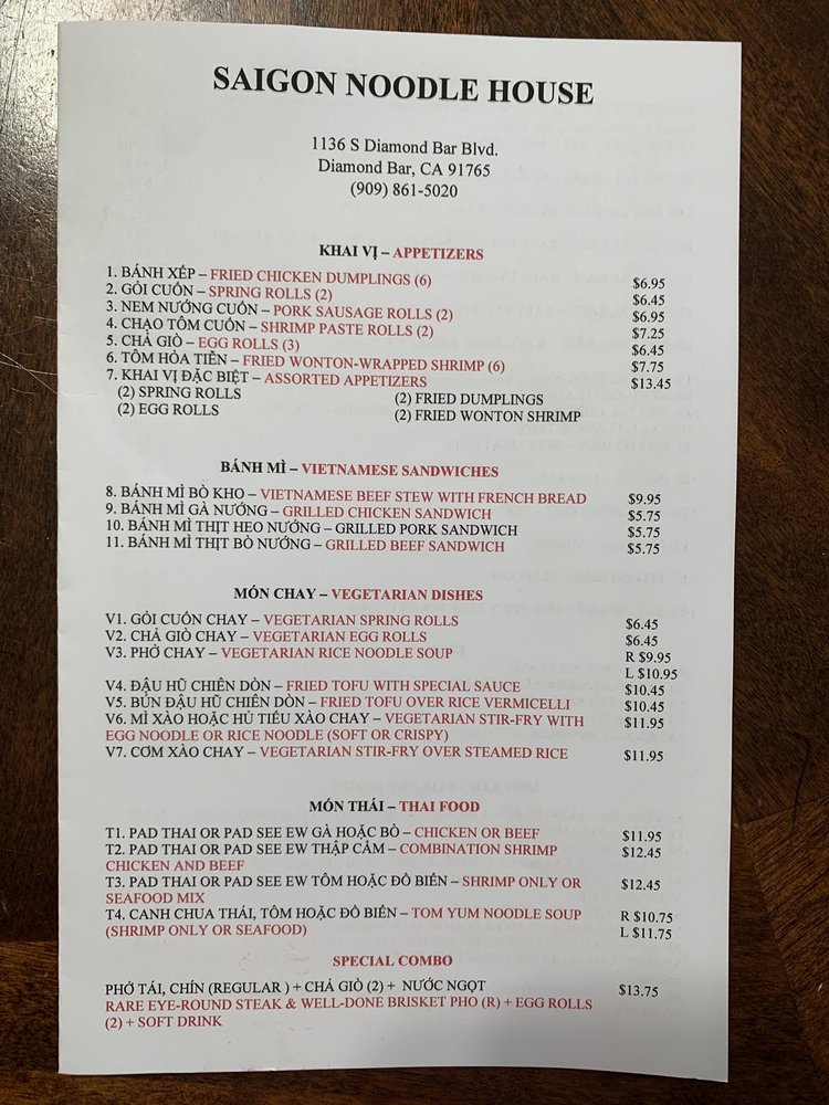 Introducing the menu at Saigon Noodle House, a Vietnamese restaurant in Diamond Bar, CA. This Asian-owned establishment offers a variety of lunch and dinner plates, including options for chicken, beef, and pork, all affordably priced. Customers rave about the authentic pho and the delicious house special combo beef noodle soup. The restaurant also serves sandwiches and noodles, with vegetarian and vegan options available. Specializing in traditional Vietnamese cuisine, Saigon Noodle House provides a welcoming atmosphere with friendly service. Other highlights include fast service, ample parking, and casual ambiance. Don't miss out on their eggrolls, BBQ pork, and pho combinations. Visit Saigon Noodle House for an authentic dining experience in a cozy setting.